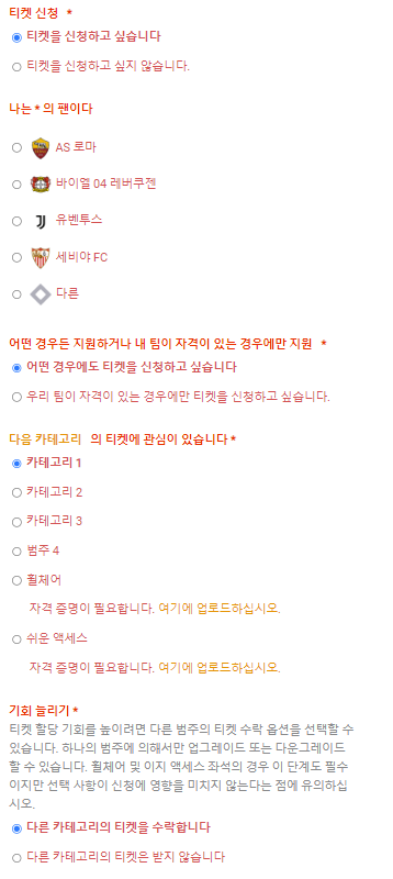 다만 자기가 선택한 팀이 결승에 올라갔을대만 티켓을 구매할건지 아니면 어떤 상황에도 구매를 할건지 선택하는 칸이 있는데 여기서 자격이 있을때만 신청한다고 한다면 그 팀이 안올라가면 신청이 캔슬이 되어버립니다. 기타는 아예 기회가 없는거구요. 그러니 첫번째를 선택해야 합니다.